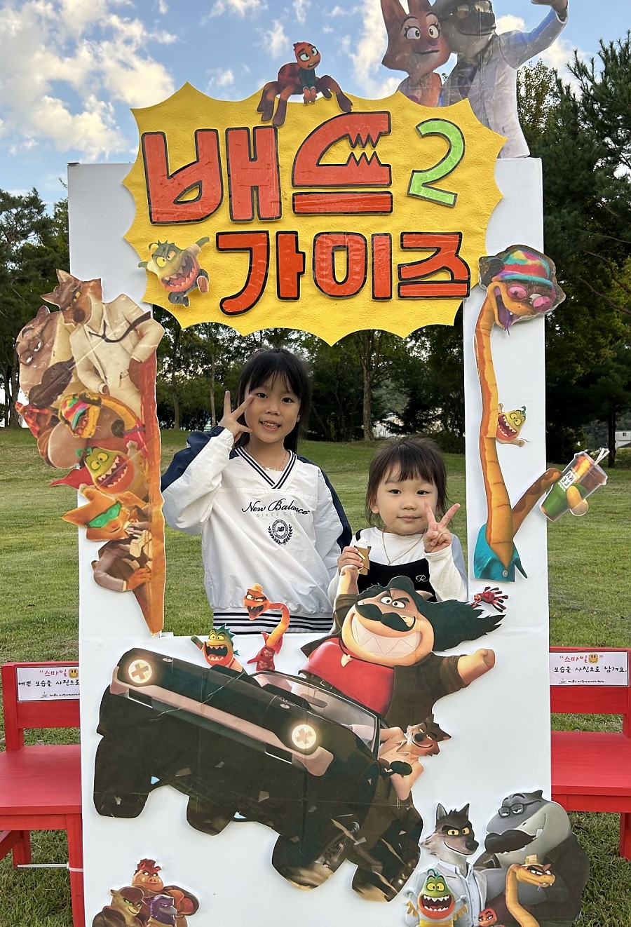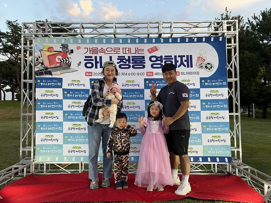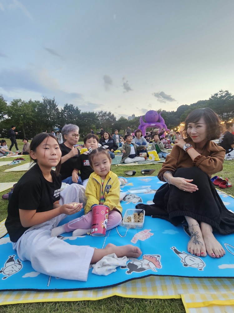온가족이 돗자리에 앉아 영화를 보며, 원에서 준비한 맛있는 간식도 나누는 즐거운 추억을 만들었습니다.