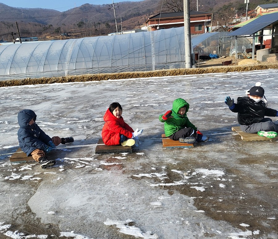 미끌미끌한 얼음을 조심스럽게 밟아보며 처음엔 살짝 탐색도 해보고, 이내 신이 나 썰매에 올라타 씽~ 하고 달려보는 아이들